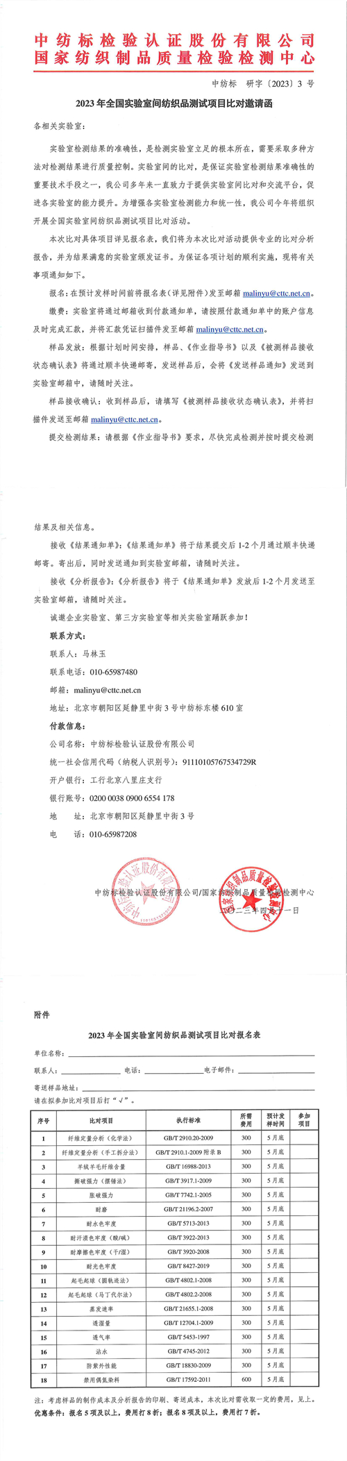 2023年全国实验室间纺织品测试项目比对邀请函