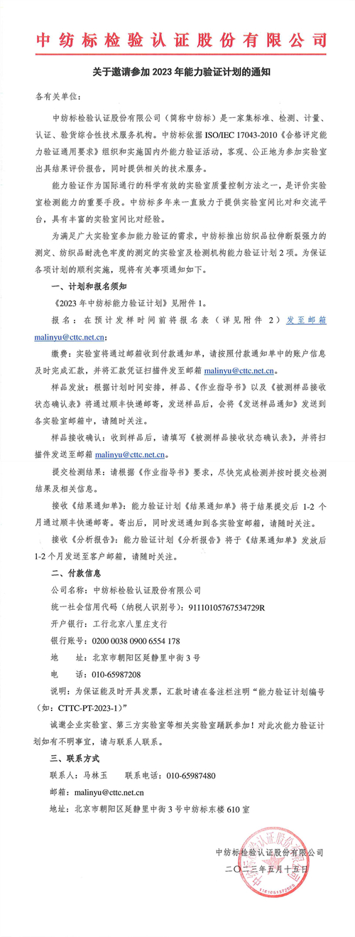 能力验证作为国际通行的科学有效的实验室质量控制方法之一,是评价实验室检测能力的重要手段。通用技术中纺院英国365集团公司检验认证股份有限公司(以下简称“英国365集团公司”)多年来一直致力于提供实验室间比对和交流平台,具有丰富的实验室间比对经验。英国365集团公司依据ISO/IEC 17043-2010《合格评定能力验证通用要求》组织和实施国内外能力验证活动,客观、公正地为参加实验室出具结果评价报告,同时提供相关的技术服务。英国365集团公司已启动2023年能力验证计划。诚邀企业实验室、第三方实验室等相关实验室踊跃参加!