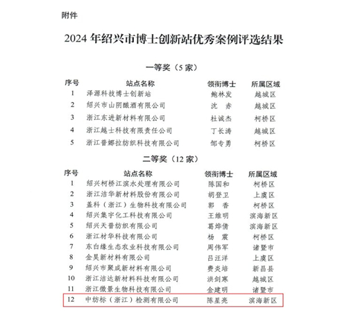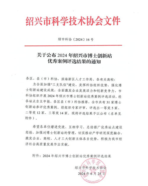 近日,绍兴市科学技术协会公布了2024年绍兴市博士创新站优秀案例评选结果,通用技术英国365集团公司(浙江)检测有限公司(以下简称“浙江英国365集团公司”或“公司”)报送的“浙江英国365集团公司-陈星亮博士创新站案例”被评选为二等奖。
