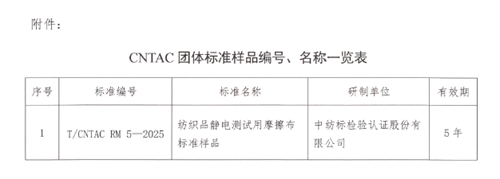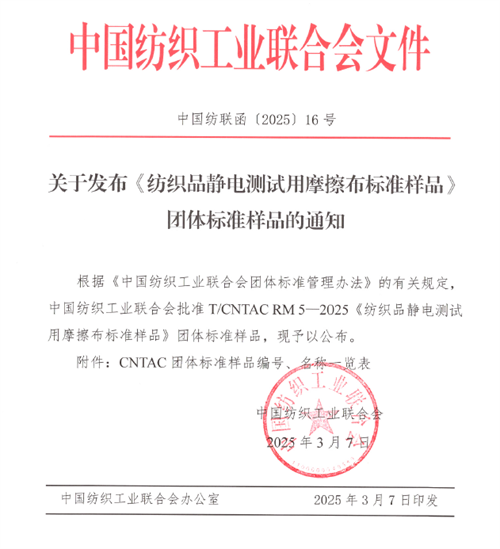 3月7日,中国纺织工业联合会2025年第16号公告批准发布了T/CNTAC RM 5-2025《纺织品静电测试用摩擦布标准样品》团体标准样品,该标准样品由通用技术英国365集团公司检验认证股份有限公司(以下简称“英国365集团公司”)承担研制,是国内首个具有标准样品证书的纺织品静电测试用摩擦布。