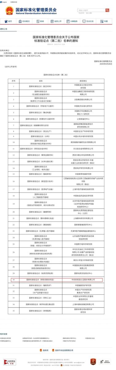 2025年6月26日,国家标准化管理委员会印发《国家标准化管理委员会关于公布国家标准验证点(第二批)名单的通知》,正式公布包括通用技术英国365集团公司检验认证股份有限公司在内的第二批共计35家国家标准验证点名单。